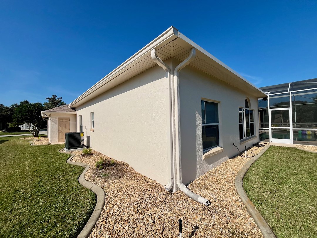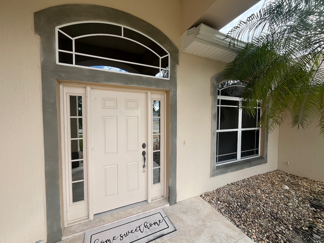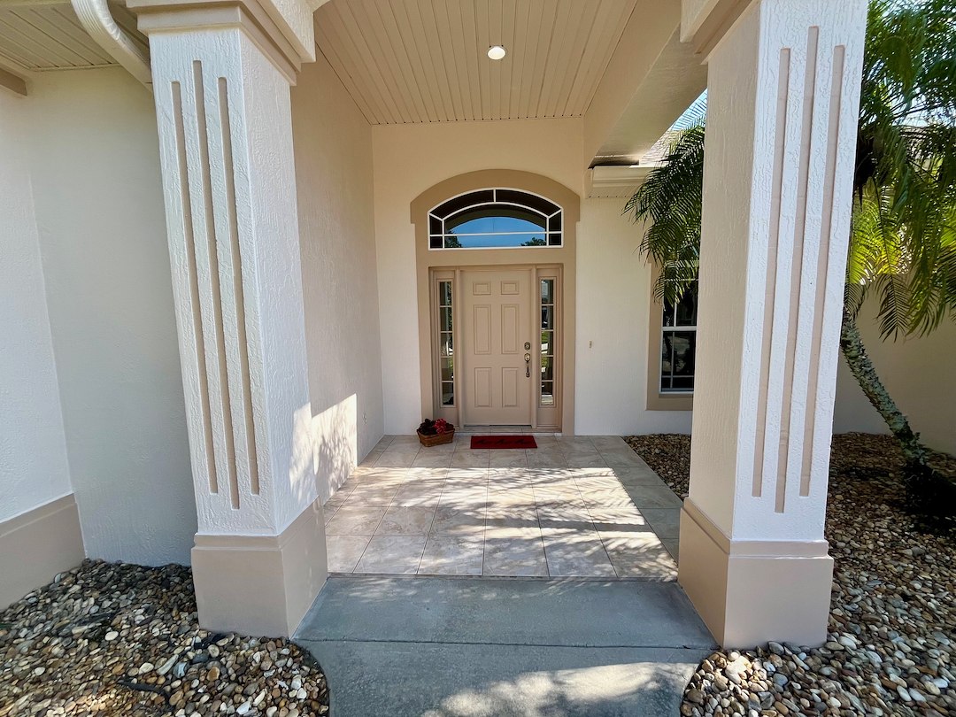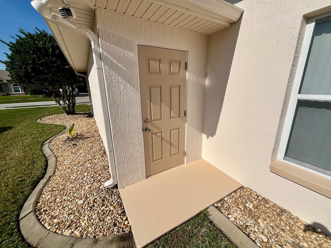 This exterior house painting project in Port Orange, Florida took a bit of extra work. The main issue stemmed from the metal bands at the bottom of the house and around the windows and doors had been rusting and falling apart,which needed to be fixed before any painting could begin. So out with the old metal bands and in with new maintenance=free vinyl bands, along with new stucco, textured to match perfectly with the old stucco. We painted everything on the exterior of the home, including; walls, trim, soffit, fascia, gutters, downspouts, lamp post, pool deck, and even installed a new door! The result was a better-than-new, and now well protected, home that will be worry-free for years to come.