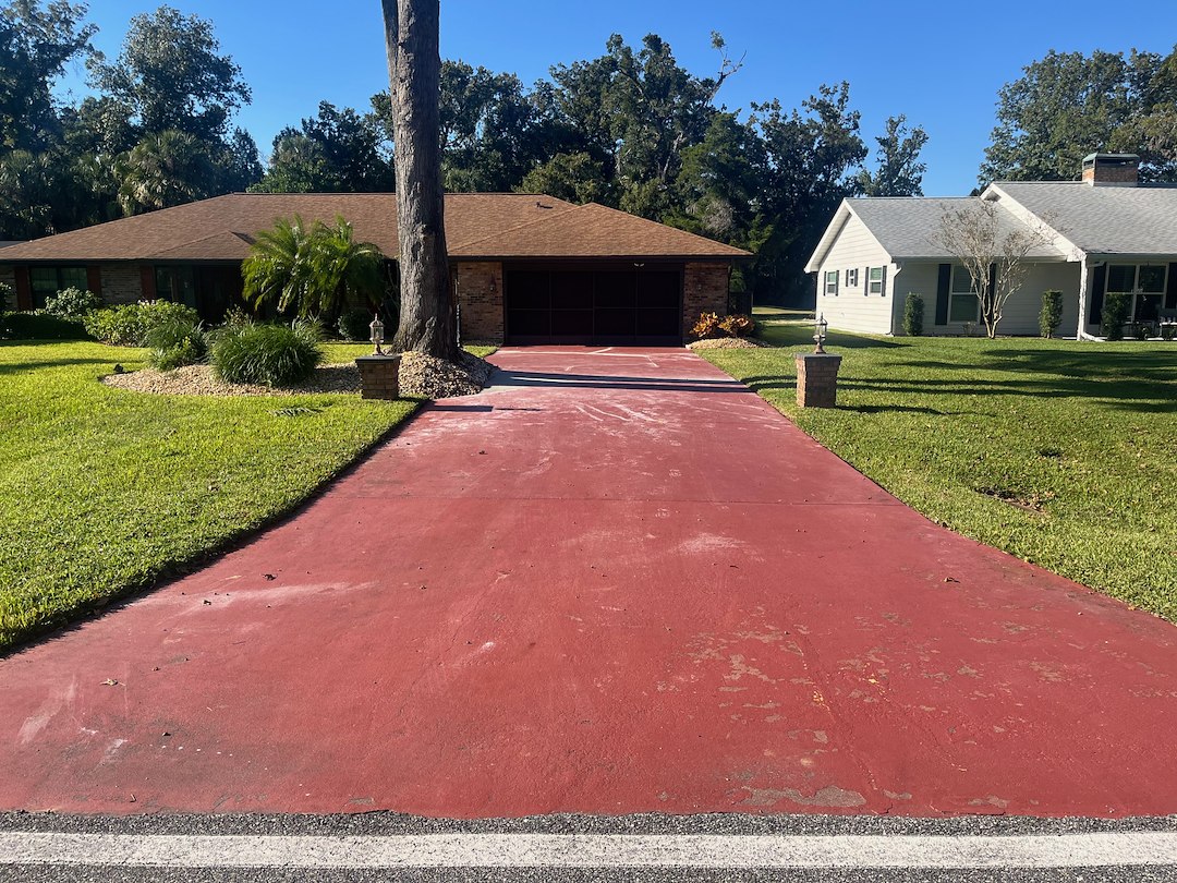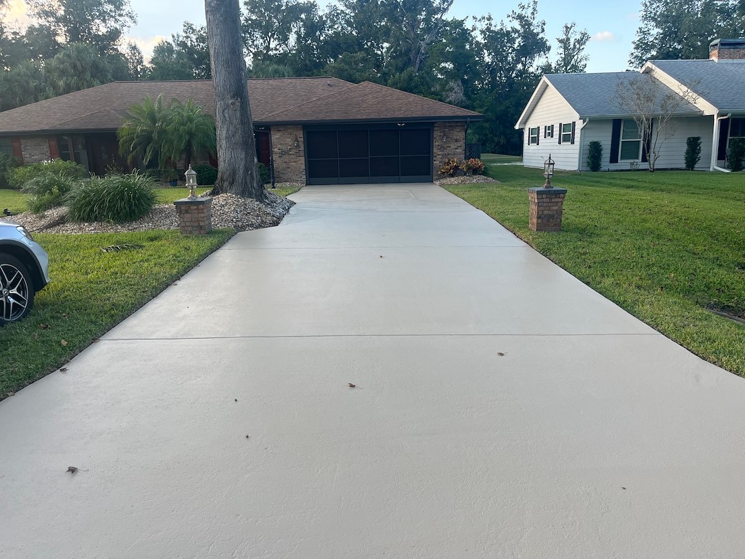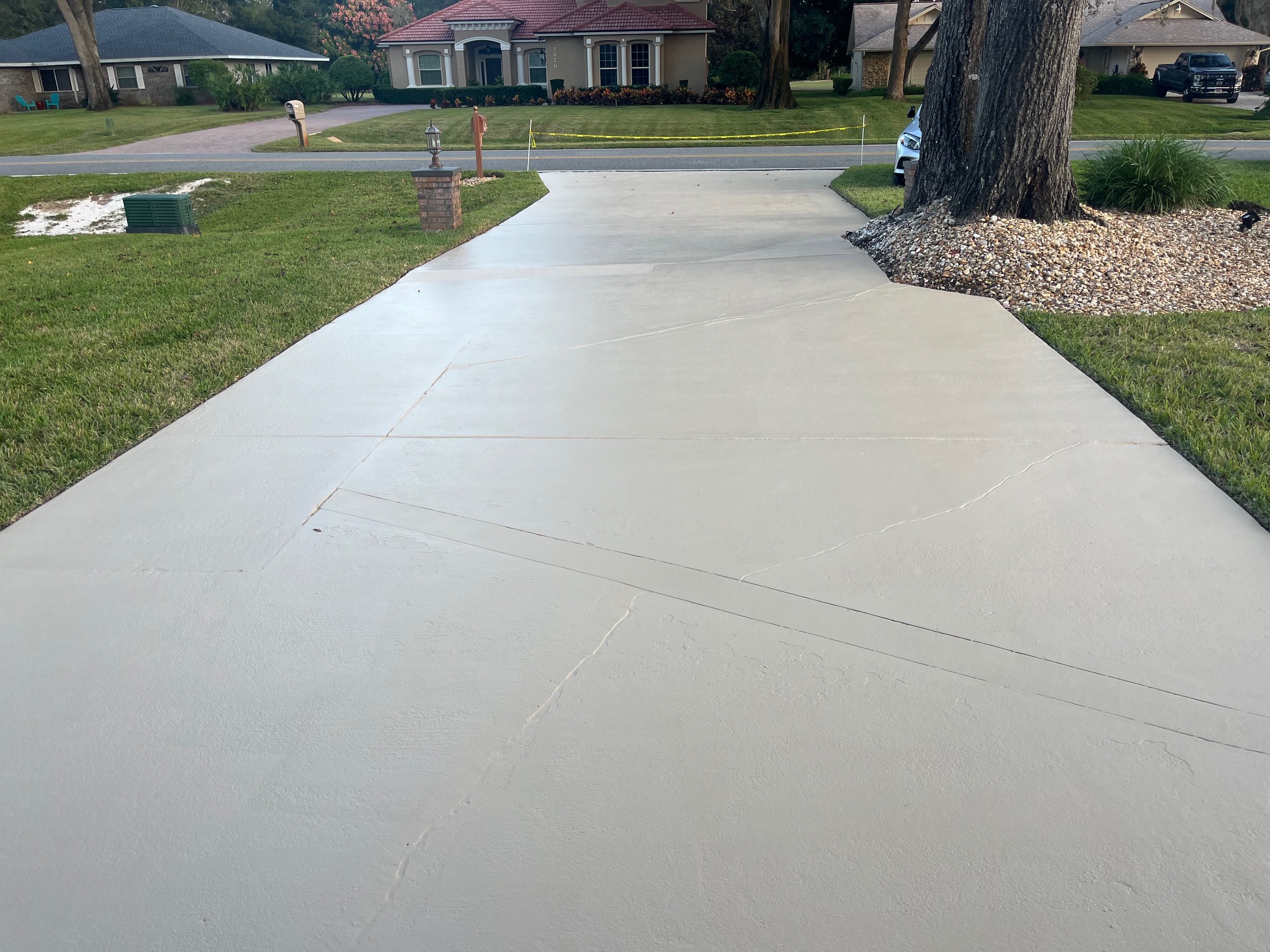 This just-completed driveway painting project in the Fly-in community of Port Orange, Florida transformed an outdated surface into a modern, refreshed entrance to the home. Our team selected a new color by pulling tones directly from the brick exterior, creating a clean, cohesive look that dramatically improved curb appeal. We also addressed structural issues by cutting out and pouring new concrete where tree roots had caused damage, and we used concrete grinding to level other uneven areas. After repairing and sealing all cracks, we applied a premium driveway coating that left the entire surface looking smooth, durable, and beautifully updated.